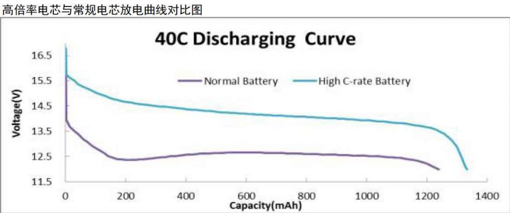 相同容量的電池在相同電流(40C)的情況下持續(xù)放電測(cè)試曲線,可以看出高倍率電池放電平臺(tái)高,且電壓下降平緩,放出更多容量。因其電池內(nèi)阻低,大電流放電損耗小,所以放電電壓平臺(tái)及容量均保持較高水準(zhǔn)。